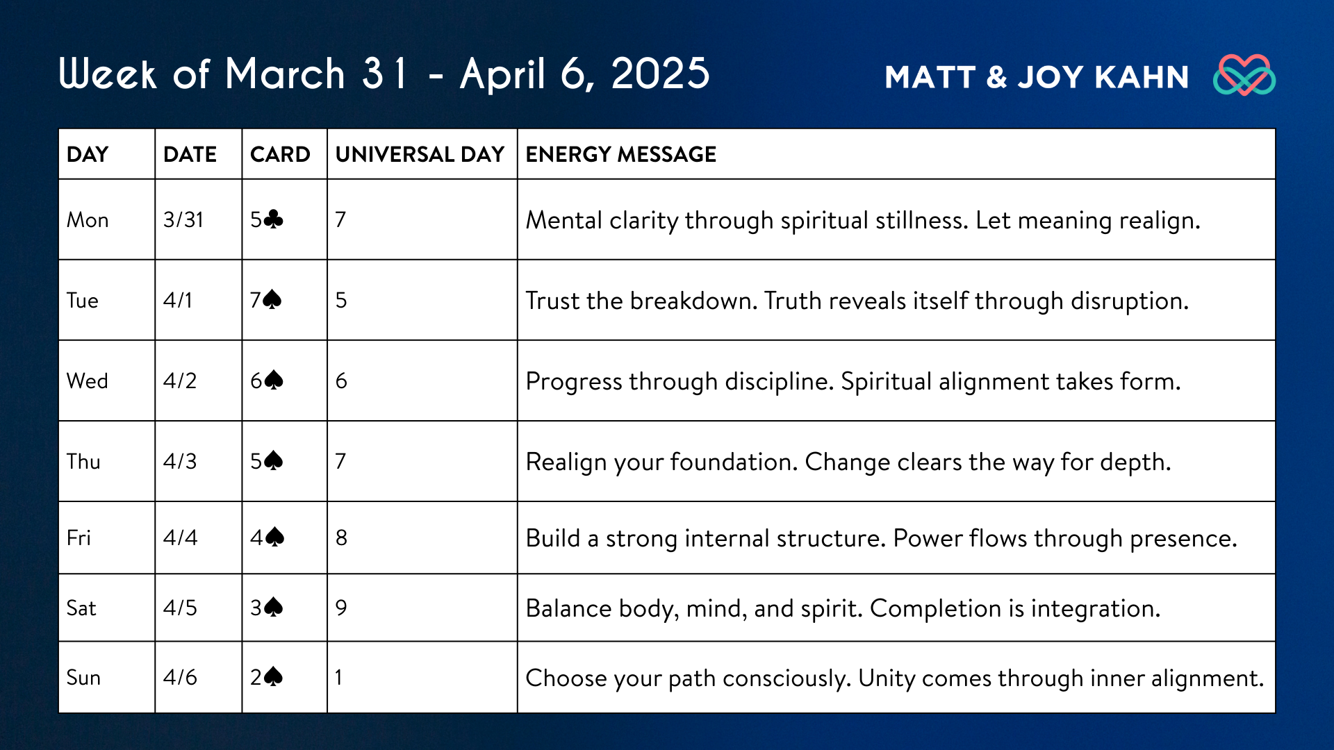 This is a day by day breakdown with energetic messages for you to carry with you throughout the week. This is a powerful part of the reading that will help you focus your attention and open your heart for all the Universe has in store for you.